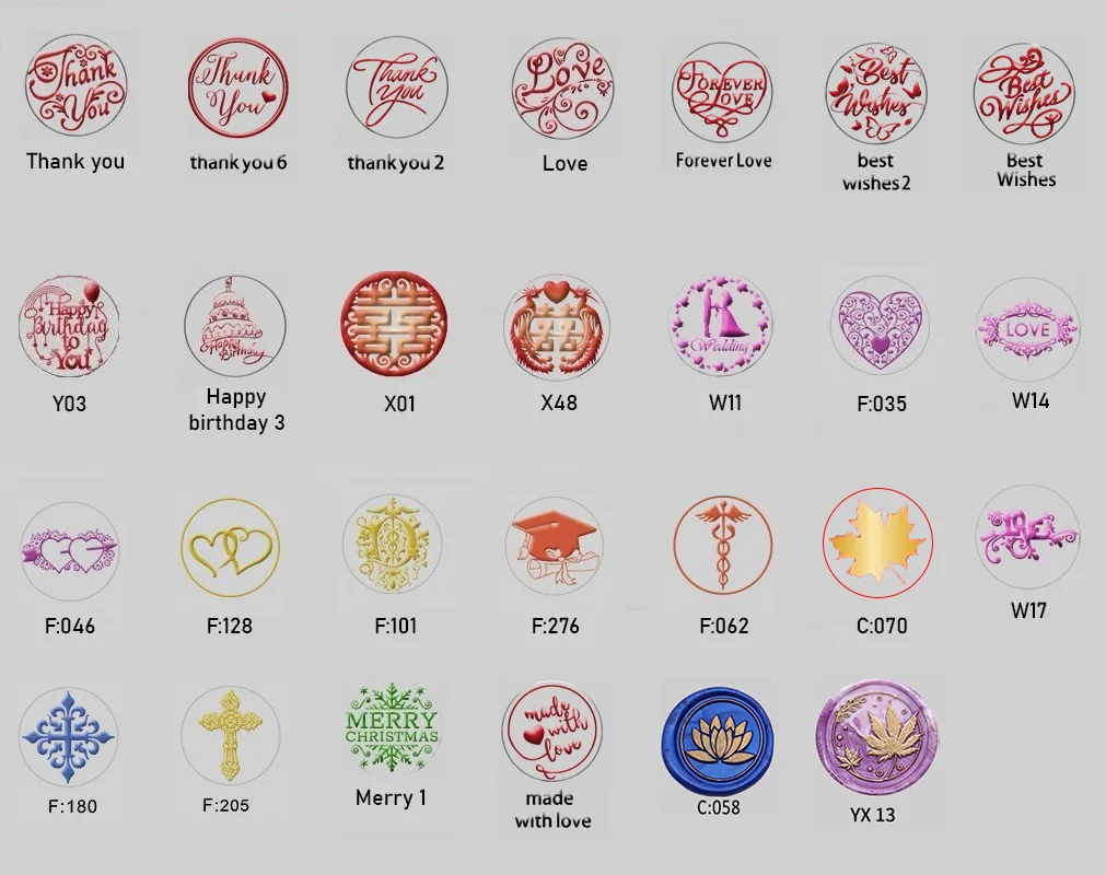 Best Wishes, Best Wishes 2, C:058, C:070, F:035, F:046, F:062, F:101, F:128, F:180, F:205, F:276, Forever Love, GX-22, GX-29, Happy Birthday 3, Love, Made with love, Merry 1, MGY-25, Mistletoe, PHÚC, Thank you, Thank you 2, Thank you 6, W11, W14, W17, W56, W60, W62, X01, X48, Y03, Y48, Y59, Y64, Y67, Y70, Y74, Y80, YX-13